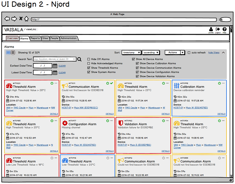Wireframe (Balsamiq): Reworked the display for zones and locations, adding icons, colour and font styles for quick status identification.